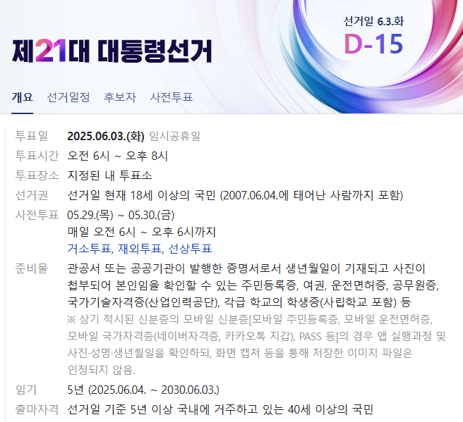 - 본투표일: 2025년 6월 03일 (수요일) 오전 6시 ~ 오후 8시