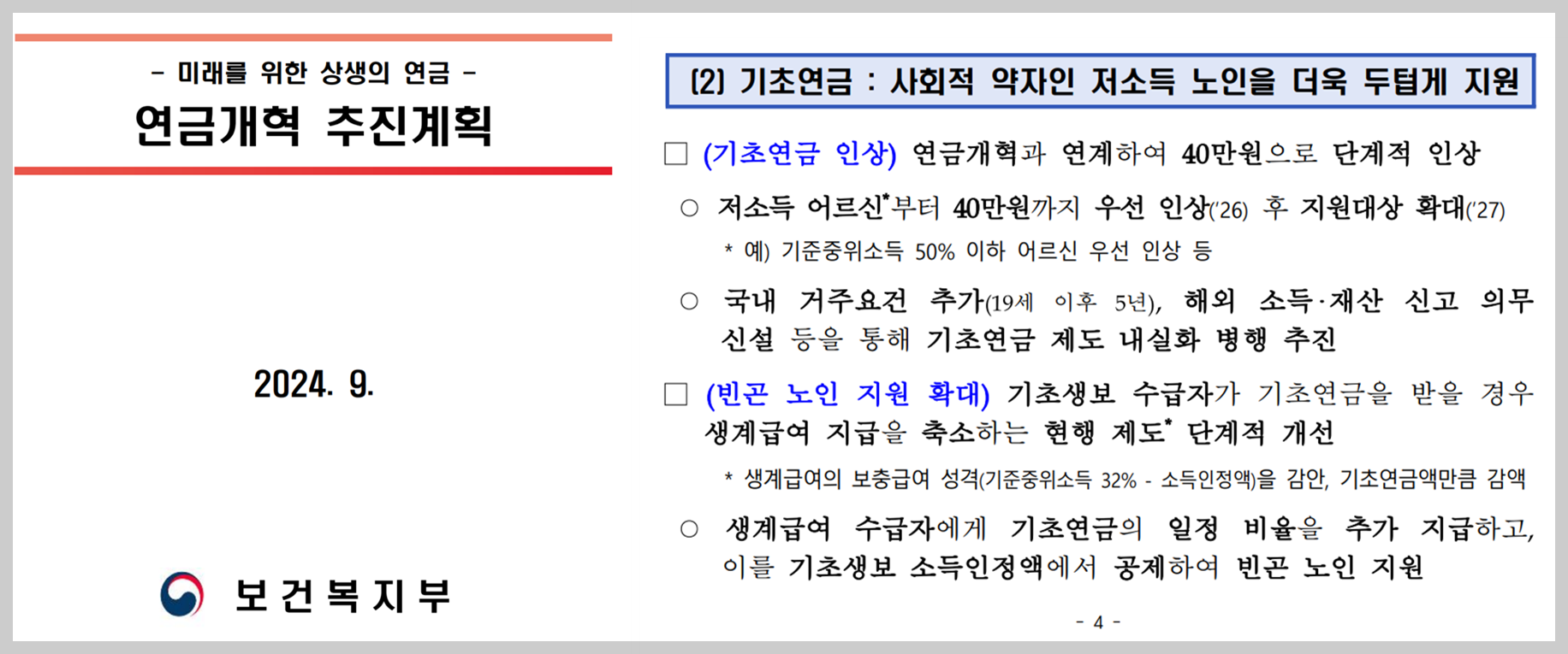 2024년 9월 정부 "연금개혁 추진계획" 발표에 따르면, 기초연금은 사회적 약자인 저소득 어르신들을 더욱 두텁게 지원할 계획이라고 합니다.